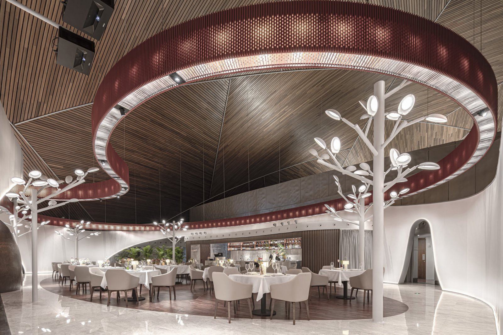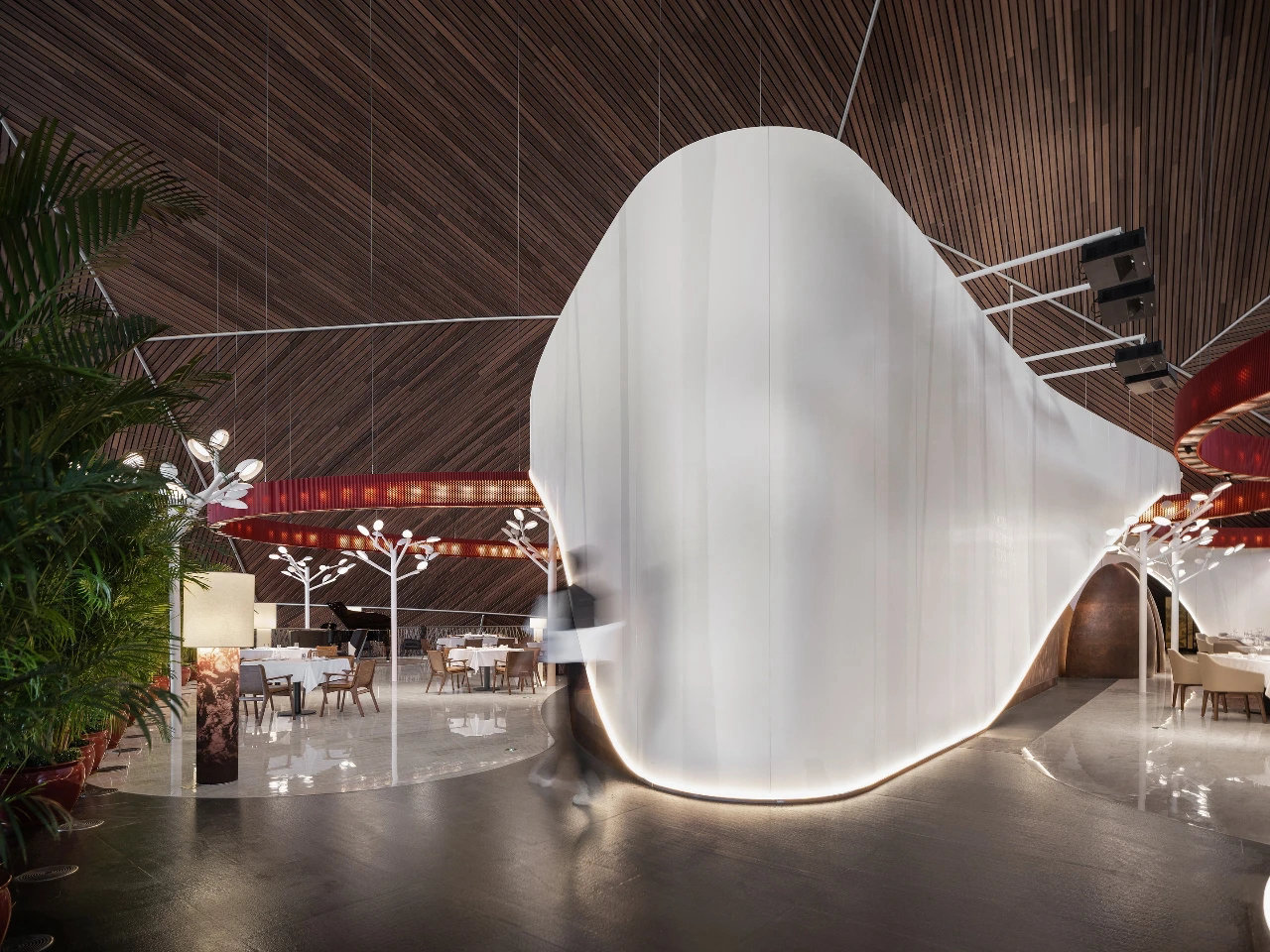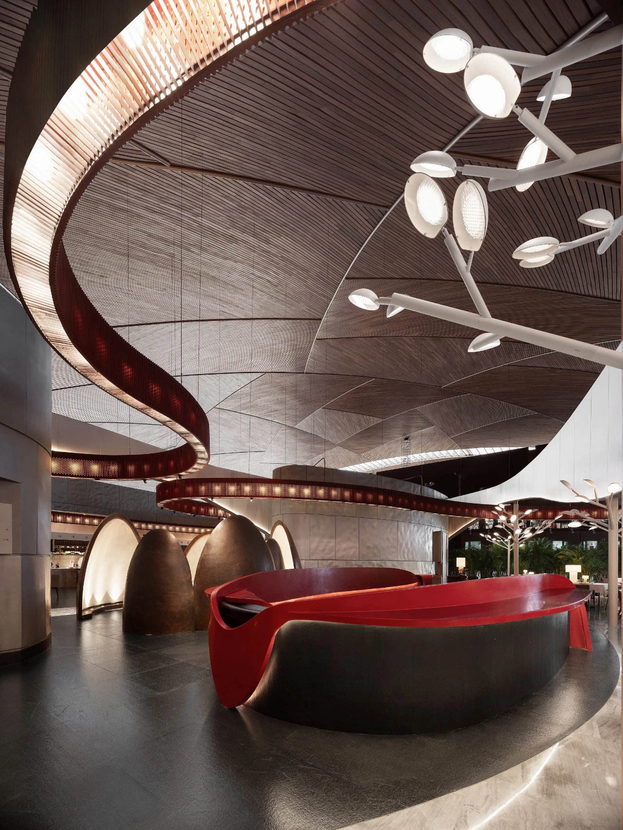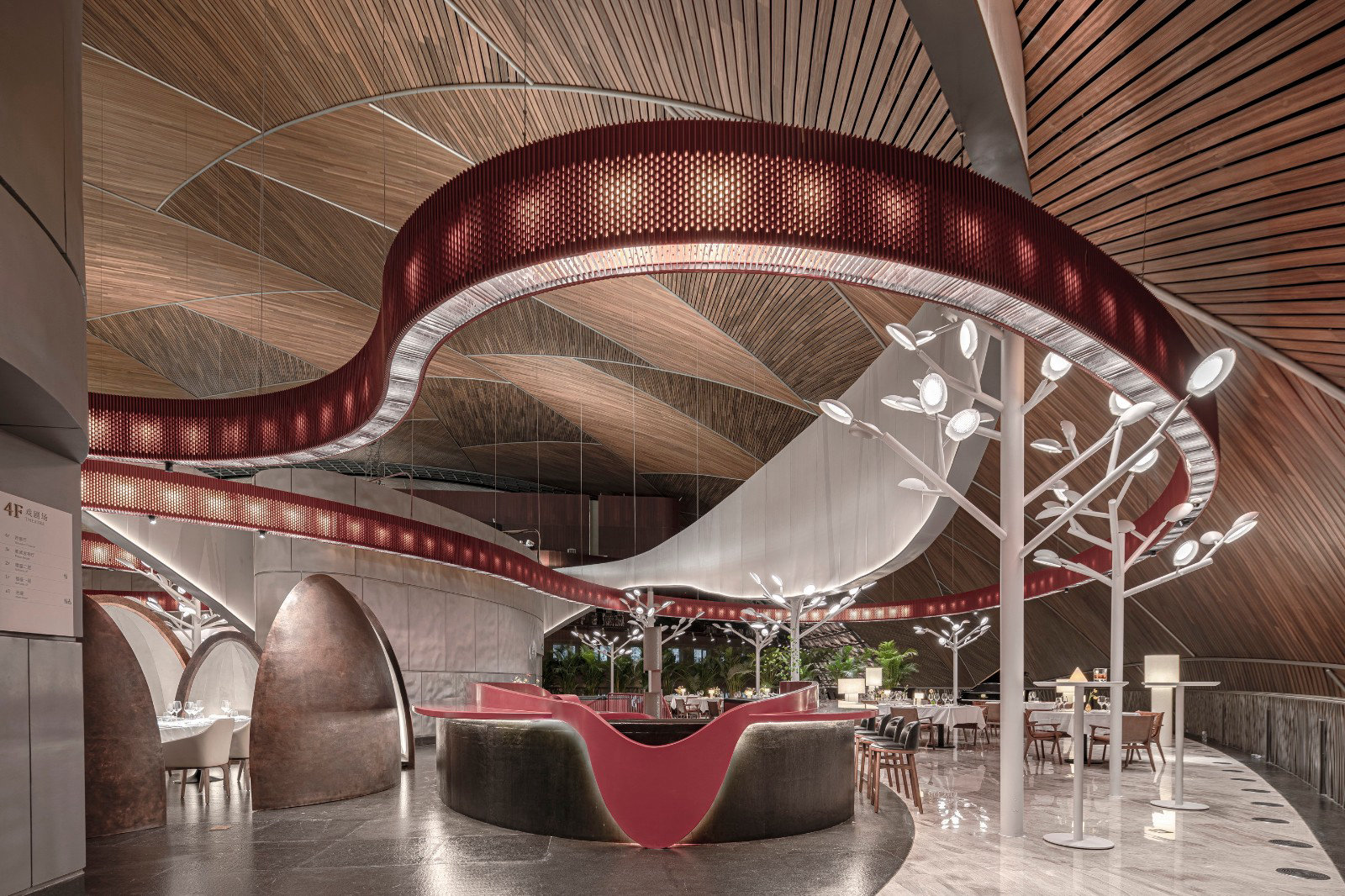 ? ? ? ?作為中國最高藝術殿堂的國家大劇院,上演著大大小小不同類別的演出,來自舞蹈藝術提煉而成的”飄帶”作為給予空間新的視覺元素。就像是一縷絲帶,讓它以自然的型態(tài)飄落在空間當中,曲線的飄帶更像是個裝置藝術品,不僅和建筑曲面拱頂形成呼應,也和建筑原有的龍燈融為一體,既能起到空間分隔功能的作用,又能豐富室內空間的層次。