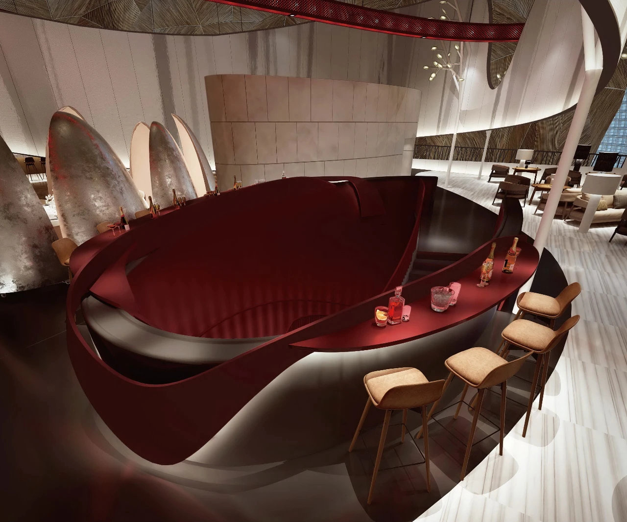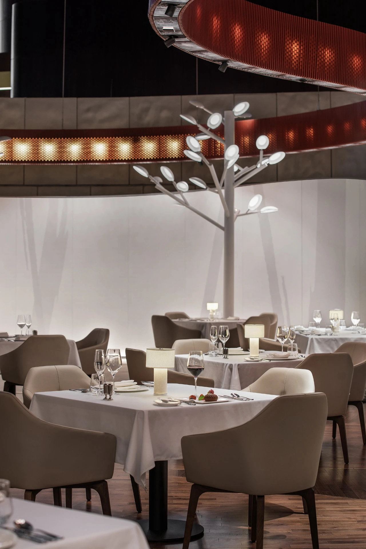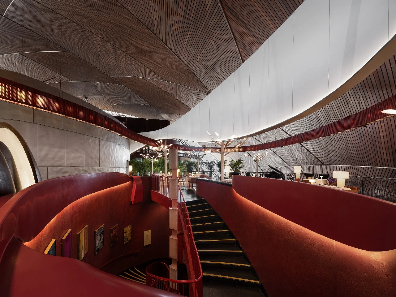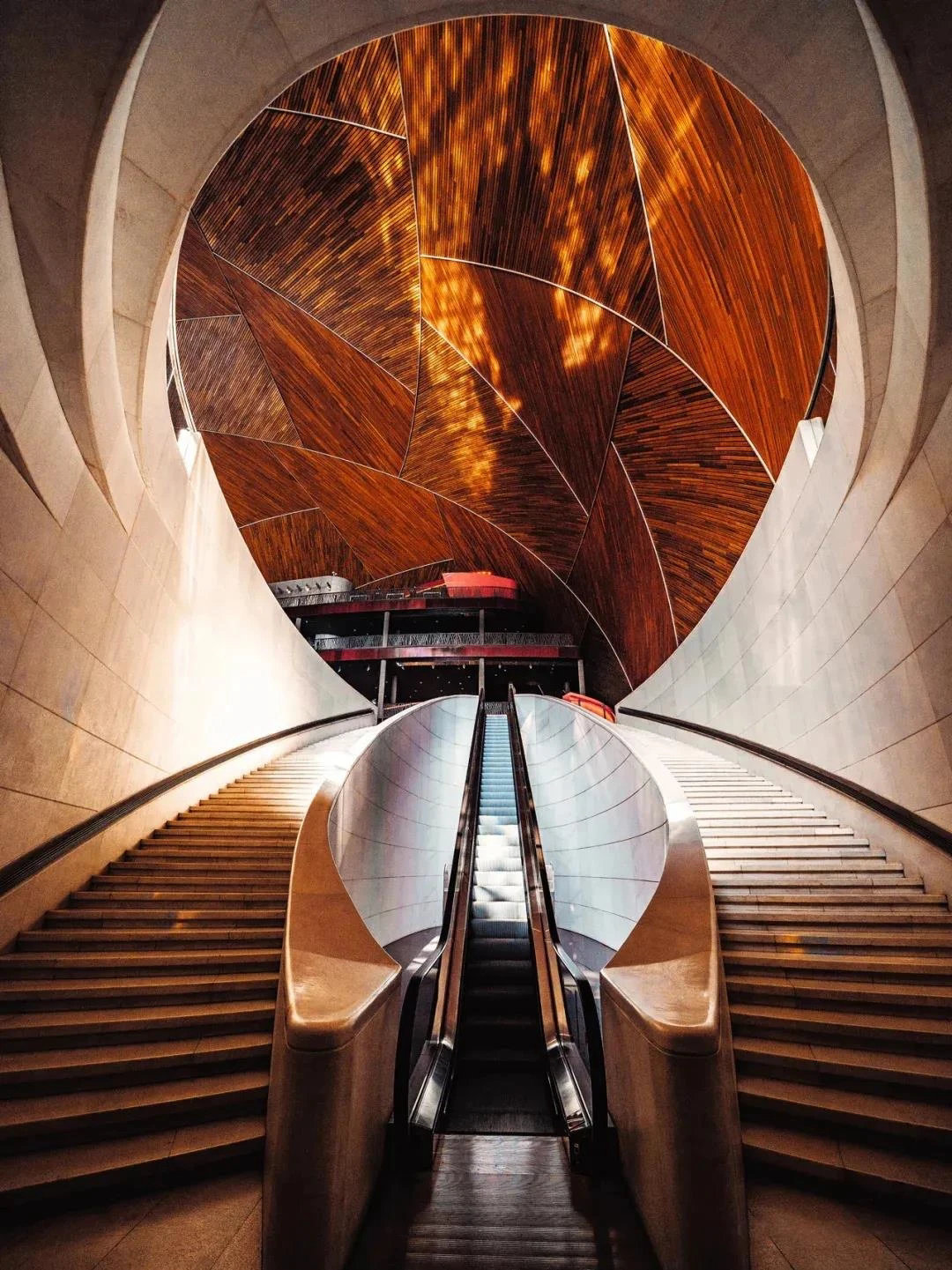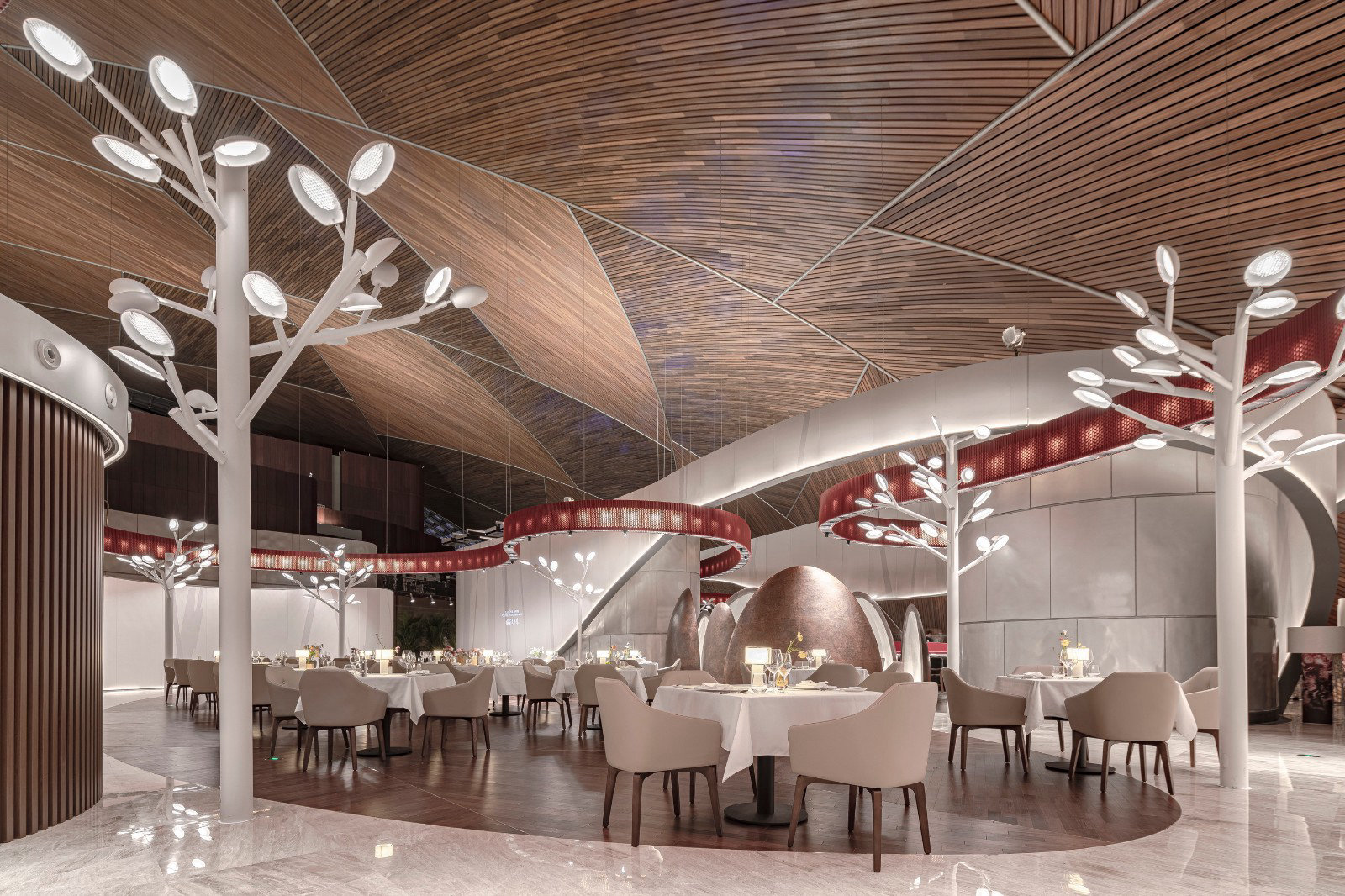 ? ? ? ?作為中國最高藝術殿堂的國家大劇院,上演著大大小小不同類別的演出,來自舞蹈藝術提煉而成的”飄帶”作為給予空間新的視覺元素。就像是一縷絲帶,讓它以自然的型態(tài)飄落在空間當中,曲線的飄帶更像是個裝置藝術品,不僅和建筑曲面拱頂形成呼應,也和建筑原有的龍燈融為一體,既能起到空間分隔功能的作用,又能豐富室內空間的層次。